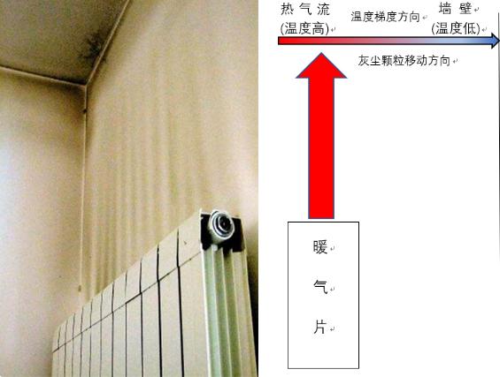 熏黑的原因不是買到了山寨的暖氣片,而是所謂的熱泳現象,又叫索瑞特現象:在流體中有穩定溫度梯度存在時,流體中的固體顆粒會朝著溫度較低的方向運動。定性來看,高溫區域流體分子運動更劇烈,對固體顆粒的撞擊力更大,就把固體顆?!巴啤钡降蜏氐牡胤饺チ恕:唵蝸碚f,因為暖氣片和它背后/上方的冷墻面有溫度梯度,空氣在流過它們之間時,顆粒物會吸附到較冷的墻面上,導致墻壁被熏黑了。